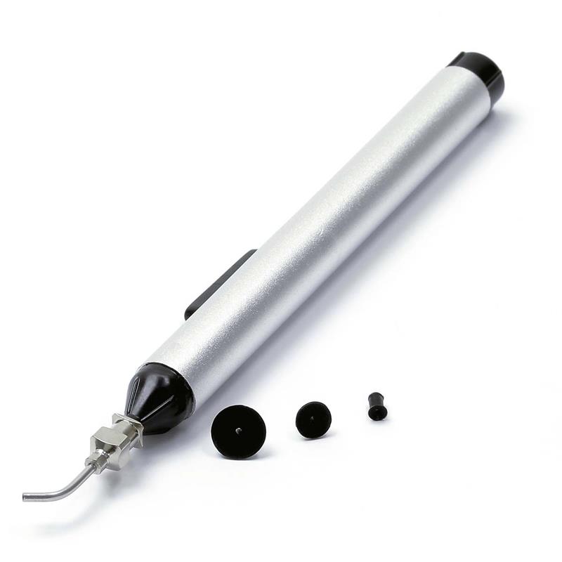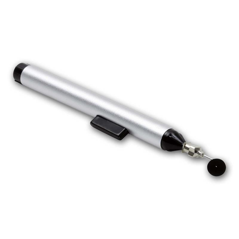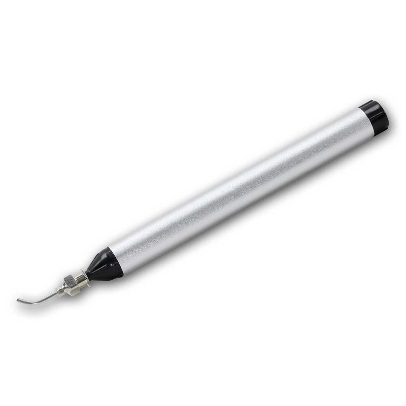 Der Vakuum-Stift, auch bekannt als Saugstift, ist ein unverzichtbares Werkzeug für präzise Arbeiten im Bereich der Mikroelektronik. Dieser Stift wurde speziell für das Handling von integrierten Schaltkreisen (IC's), SMD-Bauteilen und Kleinstbauteilen entwickelt. Mit einer gebogenen Saugdüse ausgestattet, ermöglicht der Vakuum-Stift eine gezielte und sichere Handhabung selbst kleinster Komponenten. Die besondere Eigenschaft dieses Stifts liegt in den drei mitgelieferten Saugnäpfen in den Größen von 3, 7 und 10mm. Diese Vielfalt ermöglicht es dem Benutzer, Bauteile unterschiedlicher Größe mit einem Gewicht von bis zu 40g präzise zu greifen. Die Saugnäpfe gewährleisten dabei einen stabilen Halt, sodass selbst empfindliche Bauteile sicher positioniert werden können. Der Griff des Vakuum-Stifts besteht aus hochwertigem Aluminium und misst 12,5cm in der Länge. Diese Konstruktion bietet nicht nur eine leichte Handhabung, sondern auch die nötige Stabilität beim Einsatz des Montage-Werkzeugs. Der ergonomisch gestaltete Griff sorgt dafür, dass der Anwender das Werkzeug bequem und präzise führen kann, selbst bei längerem Einsatz.