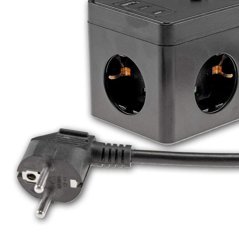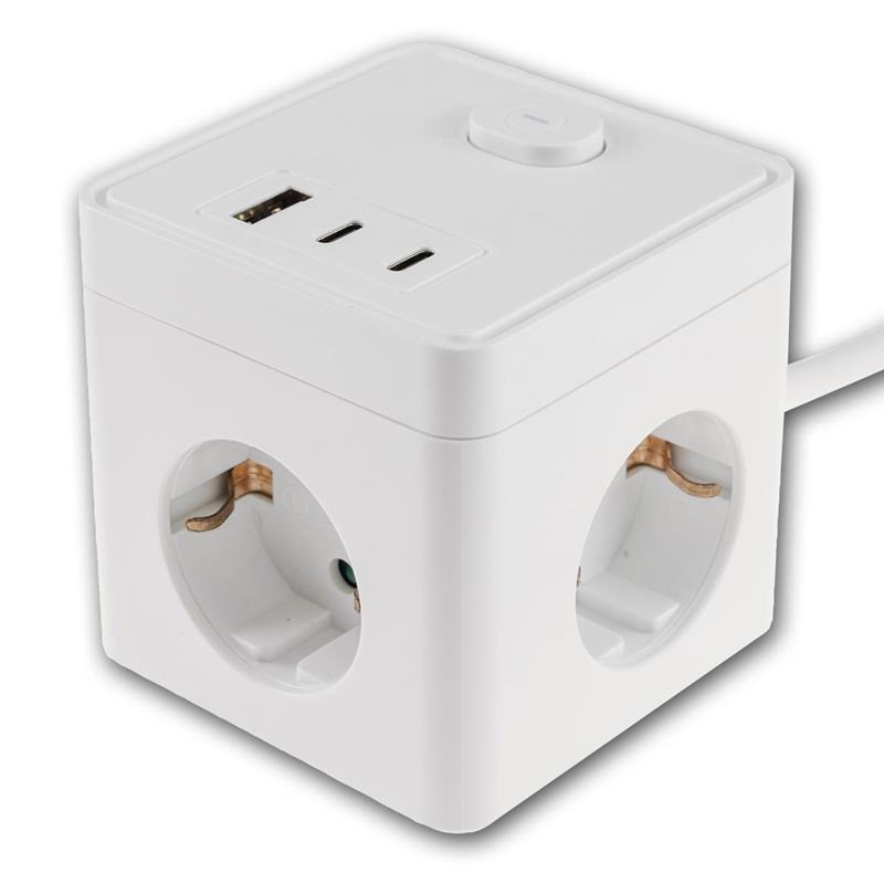 Steckdosenwürfel, 3 Schutzkontakt-Steckdosen, 1x USB-A, 3x USB-C, Hauptschalter für EIN / AUS, 1,5m Anschlusskabel mit Schutzkontakt-Stecker