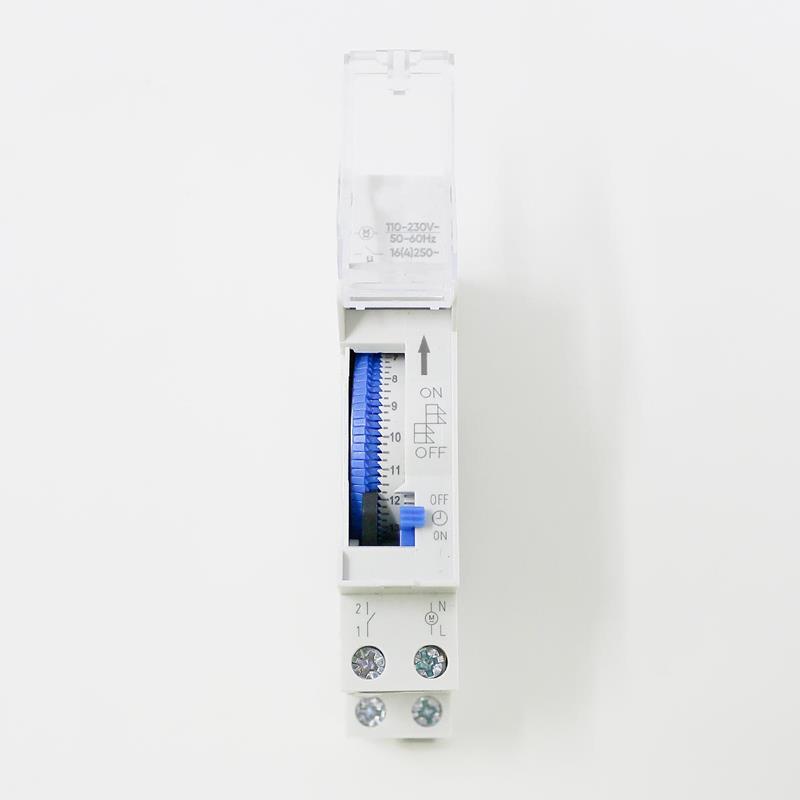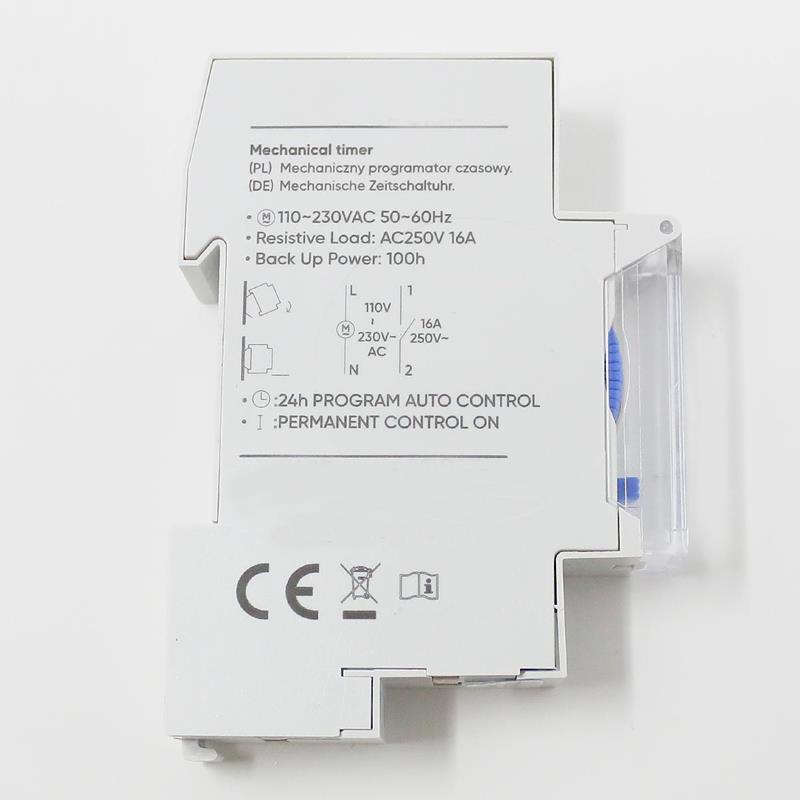 Für maximale Einsatzmöglichkeiten ist die Zeitschaltuhr für einen breiten Versorgungsspannungsbereich von 110–230V AC ausgelegt. Der robuste Schaltkontakt (NO-Kontakt / Schließer) arbeitet zuverlässig mit bis zu 16A / 250V AC. Dadurch eignet sich das Gerät hervorragend für moderne LED-Beleuchtung bis 500W und für klassische Verbraucher bis zu 1000W. Ob im Haushalt, im Gewerbe oder in industriellen Umgebungen – die Zeitschaltuhr bietet starke Leistung und hohe Zuverlässigkeit in jedem Anwendungsbereich. Ein weiterer Vorteil ist die besonders schmale Bauform von nur 18mm Breite (1 Teilungseinheit). Dadurch lässt sich die Uhr sehr platzsparend auf einer DIN-Schiene im Schaltschrank montieren und findet auch in engen Installationen problemlos ihren Platz. Das widerstandsfähige Kunststoffgehäuse in klassischem Weiß schützt die Technik zuverlässig und sorgt für eine lange Lebensdauer. Zusätzlich steht ein manueller Schaltmodus zur Verfügung. Über den praktischen Schiebeschalter können Sie jederzeit zwischen „EIN“ und „Automatik“ wechseln – ideal, wenn Sie spontan eine Beleuchtung dauerhaft aktivieren oder kurzfristige Änderungen vornehmen möchten, ohne das Programm neu einzustellen. Insgesamt bietet diese mechanische Zeitschaltuhr eine robuste, klare und benutzerfreundliche Lösung für alle, die ihre elektrischen Geräte sicher, effizient und komfortabel steuern möchten.