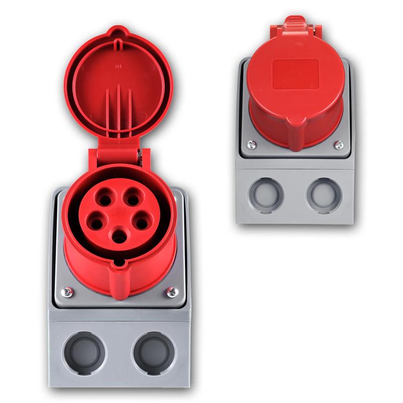 CEE Wandsteckdose mit integrierter Schutzkontakt-Steckdose, Belastung max. 415V/16A, für Aufputzmontage, mit Klappdeckel, IP44