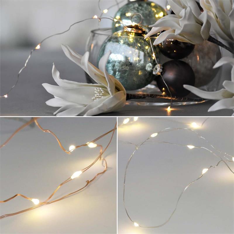 Die filigrane Draht-Lichterkette mit Micro-LEDs sorgt für stimmungsvolles Licht und vielseitige Dekorationsmöglichkeiten im Innenbereich. Der feine Draht in Silber oder Kupfer ist besonders flexibel und lässt sich leicht in Form bringen – ideal für kreative Lichtarrangements in Glasgefäßen, Kränzen, Pflanzendekorationen oder als sanft leuchtendes Highlight auf Möbeln und Regalen.