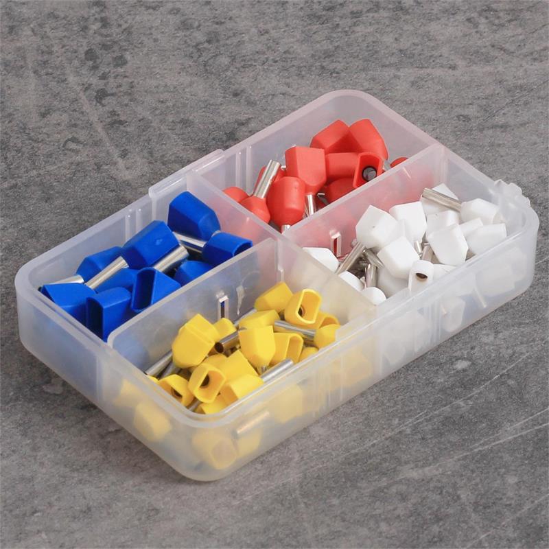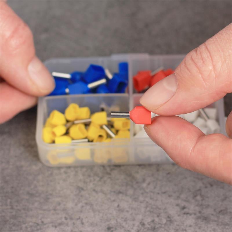 Duo-Aderendhülsen-Sortiment, 90-teilig, isolierte Schäfte in weiß, gelb, rot, blau, für Kabelquerschnitte von 0,75-2,5mm², zum verpressen/vercrimpen