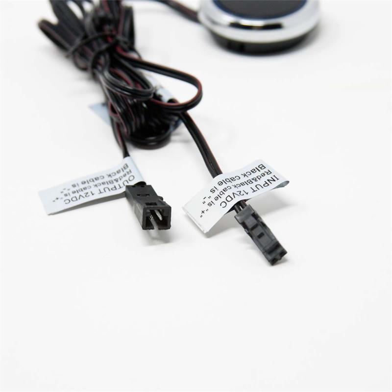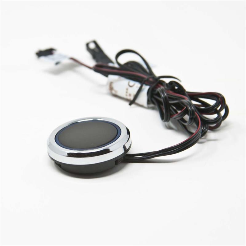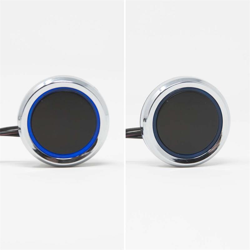 Rund, chromfarbiges Gehäuse mit blauer LED-Ringbeleuchtung, Kabellänge zum Mini-LED-Stecksystem: ca. 100cm