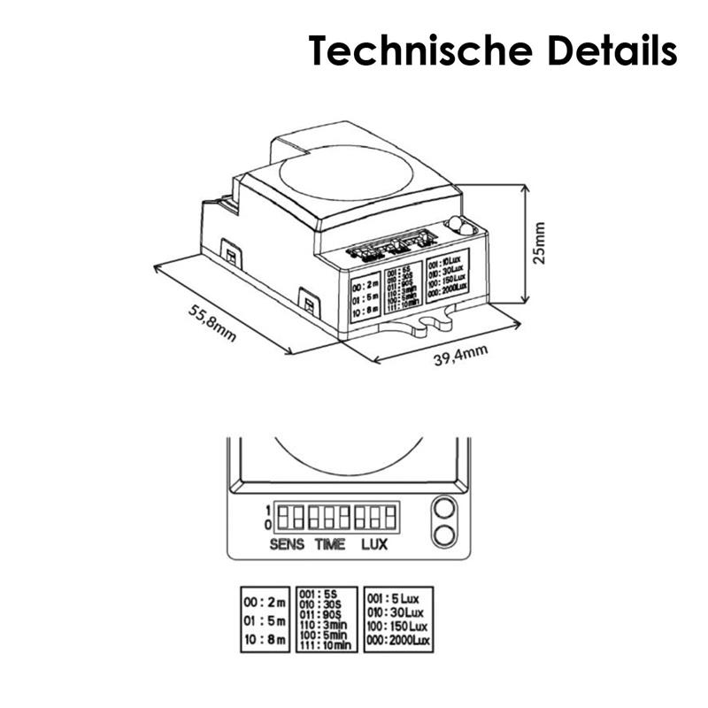 - Empfindlichkeit: 5lx, 30lx, 150lx, 2000lx (einstellbar über Jumper)