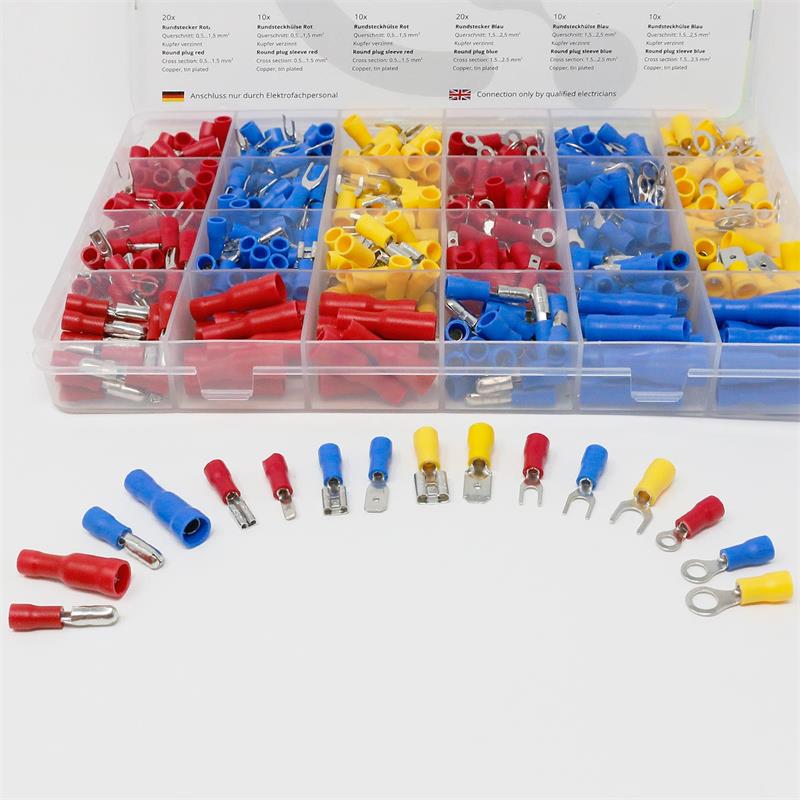 500-teiliges Quetschverbinder-Sortiment 0,5 bis 2,5mm², Gabelkabelschuhe, Ringkabelschuhe, Aderendhülsen, Flachsteckhülsen & -stecker, Rundsteckhülsen & -stecker in Fächern sortiert, zum verpressen/vercrimpen