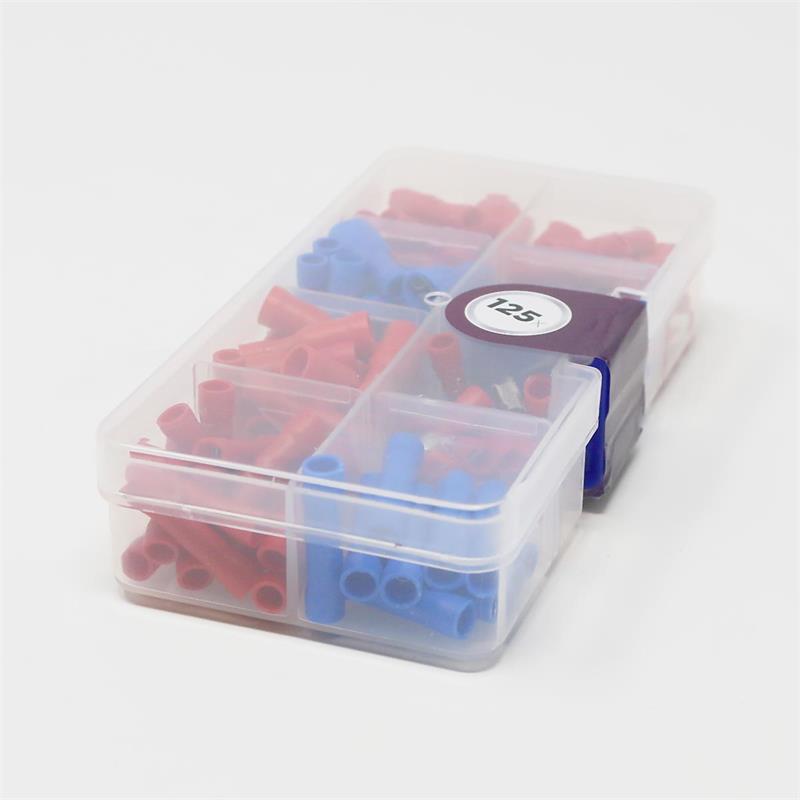 125-teiliges Sortiment mit verschiedenen Kabelschuhen in rot und blau für Leitungsquerschnitte zwischen 0,5 und 2,5mm², in praktischer Kunststoffbox