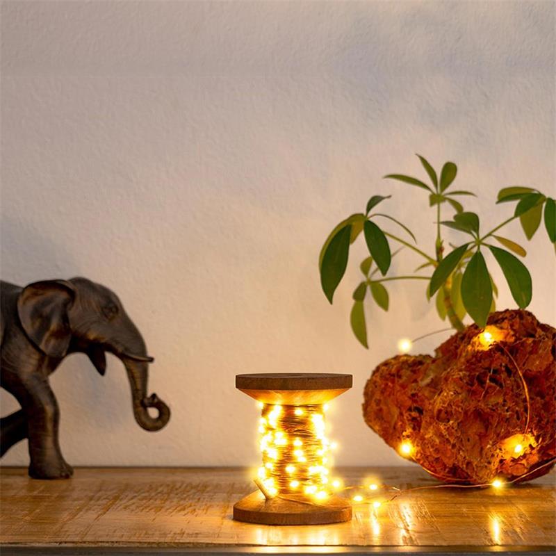 Die LED Lichterkette „Garnspule“ kombiniert natürliche Materialien mit moderner Lichttechnik und wird so zum stilvollen Highlight jeder Inneneinrichtung. Auf einer edlen, dunkelbraunen Echtholz-Spule aufgewickelt, liegt der filigrane Kupferdraht mit gleichmäßig angeordneten Micro-LEDs im Abstand von etwa 10 Zentimetern. Das warmweiße Licht (2700K) schafft eine gemütliche Atmosphäre und bringt Dekorationen, Pflanzen oder Möbelstücke sanft zum Leuchten. Dank der abnehmbaren Lichterkette kann sie sowohl auf der Spule als dekoratives Lichtobjekt verwendet als auch frei im Raum arrangiert werden – etwa in Vasen, Regalen, Wandnischen oder auf dem Esstisch. Der biegsame Draht ermöglicht dabei eine individuelle Gestaltung und sicheren Halt ohne Verrutschen.