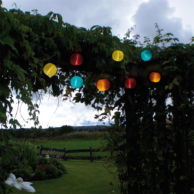 Verwandeln Sie Ihren Garten, Balkon oder Ihre Terrasse in eine stimmungsvolle Wohlfühloase mit unserer LED Solar-Lichterkette. Die kompakte Lichterkette besteht aus langlebigem ABS-Kunststoff und Polyester und ist mit zehn dekorativen Lampions ausgestattet, die jeweils eine kaltweiße LED enthalten. Mit einem Lampion-Durchmesser von 7,5cm und einem Abstand von 30cm sorgt sie auf einer Gesamtlänge von 4,7m für gleichmäßige Beleuchtung und setzt stimmungsvolle Lichtakzente auf Balkon, Terrasse oder im Garten. Dank des integrierten Solarpanels und des NiMH-Akkus benötigt die Lichterkette keine externe Stromversorgung: Tagsüber wird der Akku durch Sonnenenergie aufgeladen und bei einsetzender Dämmerung schaltet sich die Beleuchtung automatisch ein. So genießen Sie bis zu sechs Stunden stimmungsvolles Licht, ohne sich um Batterien oder Steckdosen kümmern zu müssen. Die Installation ist besonders einfach: Das Solarpanel wird mit dem Erdspieß im Boden fixiert und das transparente Verbindungskabel ermöglicht ein unauffälliges Aufhängen der Lichterkette. Ein integrierter Dämmerungssensor und ein Ein-/Ausschalter am Solarpanel sorgen für zusätzlichen Komfort. Die wetterfeste Lichterkette mit Schutzklasse IP44 ist für den Innen- und Außenbereich geeignet und trotzt Regen oder Spritzwasser.