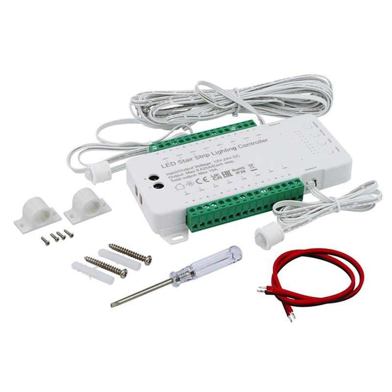 LED Treppenlicht-Steuerungskit mit zwei PIR Sensoren, für 16 Stufen, verschiedene Funktionen einstellbar, Eingangsspannung 12V DC oder 24V DC, nur für Innenbereiche