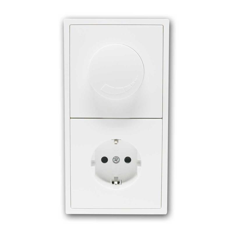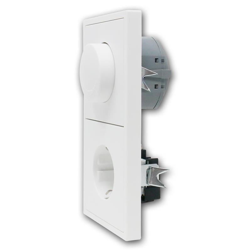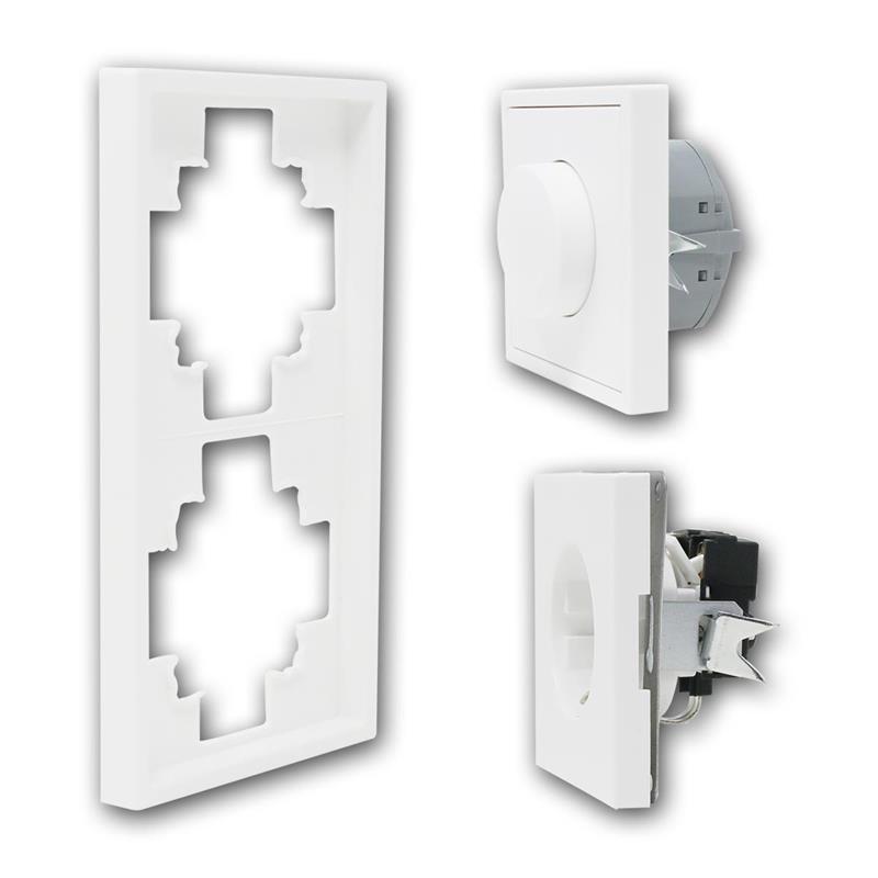 LED-Dimmer und Steckdose mit 2-fach Rahmen, Farbe weiß, minimalistisches Design, samtiger Oberfläche, Dimmer schaltet 4W bis 300W