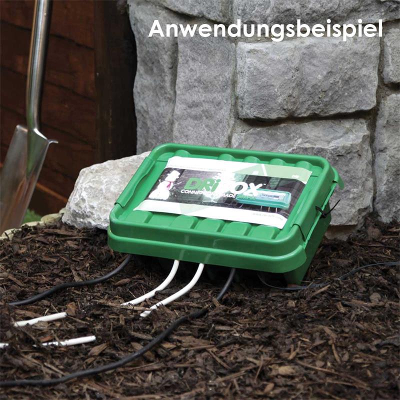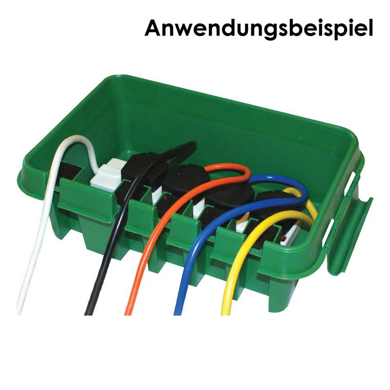 Die robuste Schutzbox "DRiBOX" für jedes Wetter gewährleistet einen zuverlässigen Schutz für Stecker und Kabelverbindungen selbst in herausfordernden Umgebungen. Mit fünf Kabeldurchführungen bietet sie eine flexible Nutzung und schützt gleichzeitig effektiv vor den Elementen. Eine anpassungsfähige Silikondichtung, die den Deckel und das Innere der Box umschließt, gewährleistet eine sichere Einbettung von Kabeln und Steckdosen. Dies verhindert nicht nur ein Verrutschen, sondern auch das Eindringen von Feuchtigkeit. Durch die Schutzklasse IP55 sind Ihre Erweiterungen und Anschlüsse optimal vor den Einflüssen der Witterung geschützt. Die Box hält nicht nur Schmutz und Staub fern, sondern trotzt auch Feuchtigkeit. Zudem ist sie frostbeständig, wodurch ihre Funktionalität selbst bei niedrigen Temperaturen erhalten bleibt. Die vielseitigen Anwendungen dieser Kabelbox erstrecken sich über verschiedene Bereiche. Sie eignet sich optimal für den Einsatz im Garten, auf Baustellen, in industriellen Umgebungen, bei Freiluftveranstaltungen oder an anderen Orten, an denen elektrische Verbindungen extremen Wetterbedingungen ausgesetzt sind.