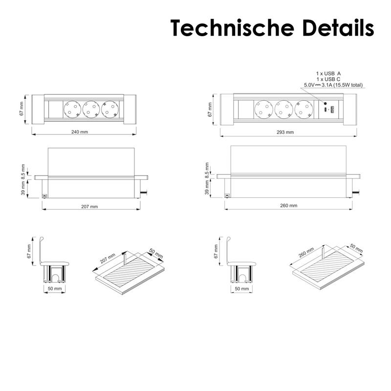 Verfügbar in zwei Varianten, entweder mit drei Schutzkontakt-Steckdosen oder mit drei Schutzkontakt-Steckdosen plus zwei USB-Anschlüssen, bietet die "FLATBOX" für unterschiedliche Bedürfnisse die passende Lösung. Diese durchdachte Steckdosenleiste ist eine praktische und stilvolle Ergänzung für jeden modernen Arbeitsplatz.